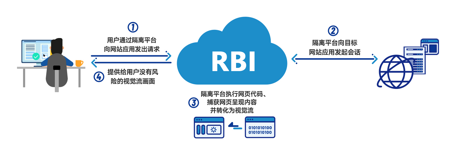 Isolation)简称为RBI,是一种通过常规浏览器远程操作远程浏览器的模式,而远程浏览器则运行在一个云容器服务器内,所有的网页加载代码执行由远程浏览器完成,并将可视化的渲染结果返回给常规浏览器,达到隔离访问网页的目的。